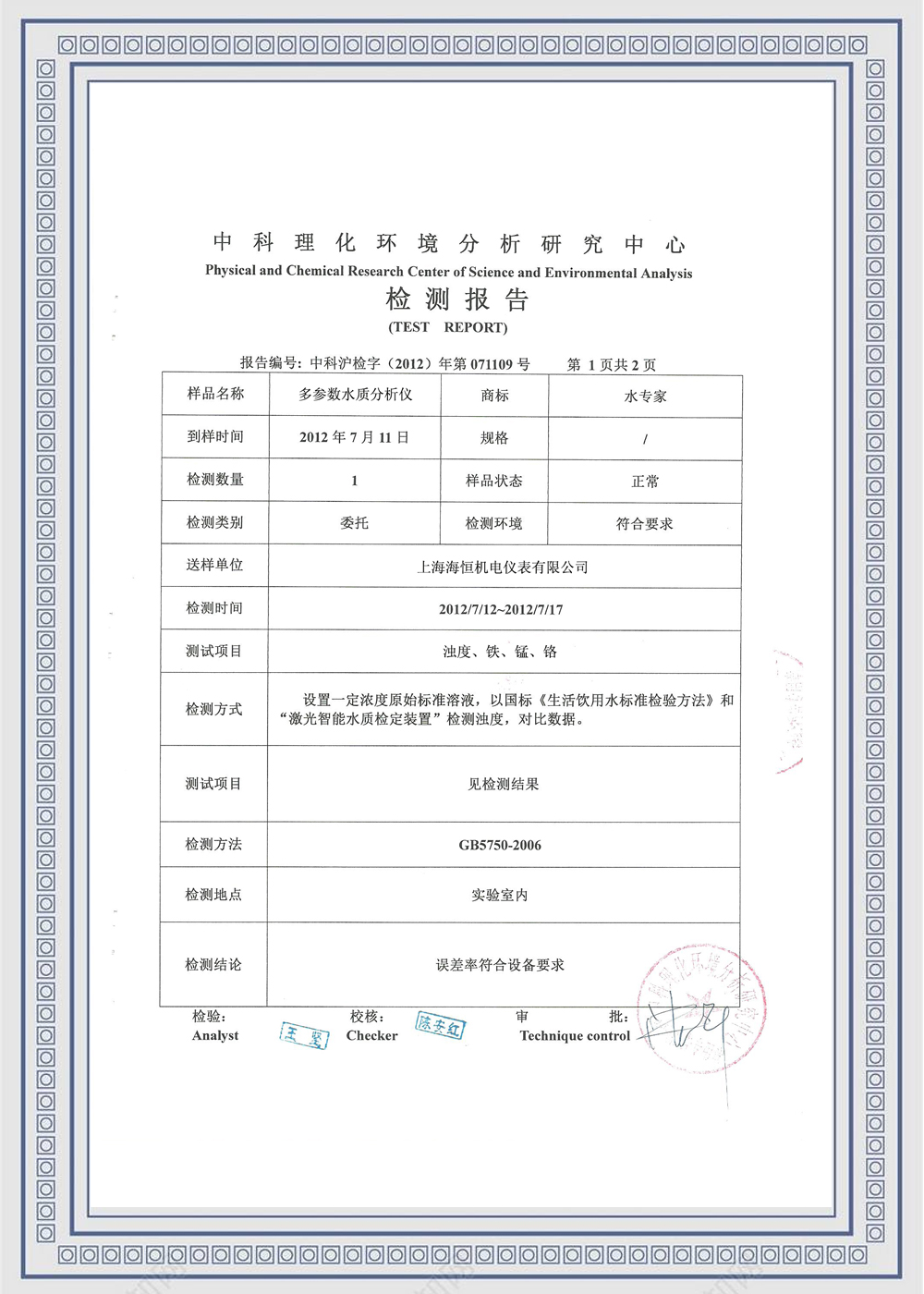 2 | 余氯(總氯)10 | 0~10.00mg/L | 0.01mg/L | ±5% | |