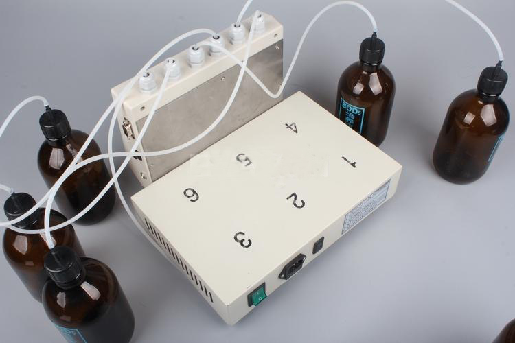 主機:在實驗時,主機放入培養箱(選配或自備)內,主機內有6只磁力攪拌器,實驗過程中它帶動培養瓶內的攪拌子對水樣進行攪拌,以促進培養瓶內空氣中的氧氣溶解于樣品液中,保證在整個實驗過程中,水樣中的微生物有足夠的溶解氧進行生化反應。